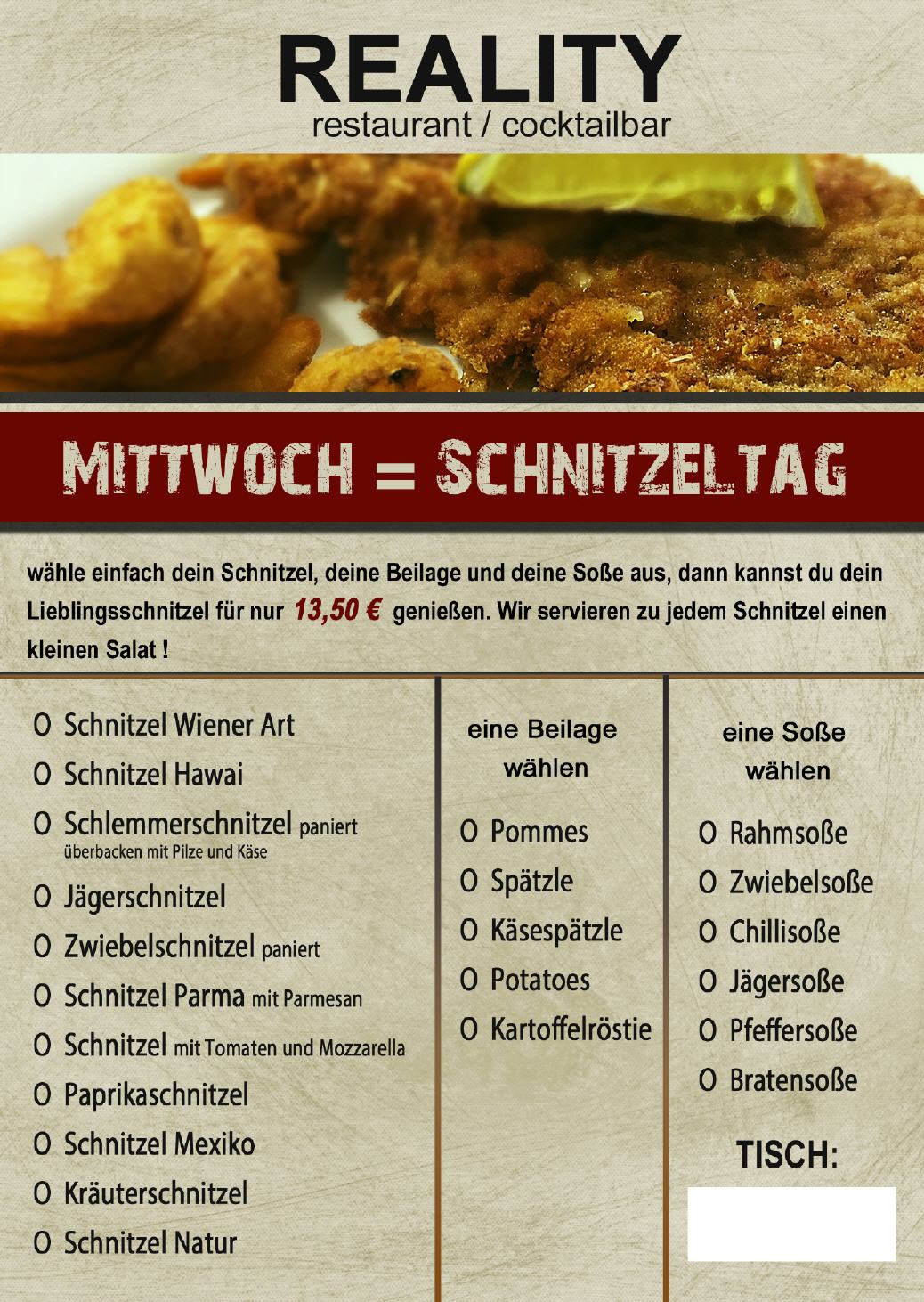 ACHTUNG nur Mittwochs Schnitzel wie du es magst....... jeden Mittwoch ist bei uns Schnitzeltag, Schnitzel wählen, Soße und Beilage wählen und das ganze für nur 12,00 € genießen. Leider kann es am Mittwoch etwas länger bei der Lieferung dauern.